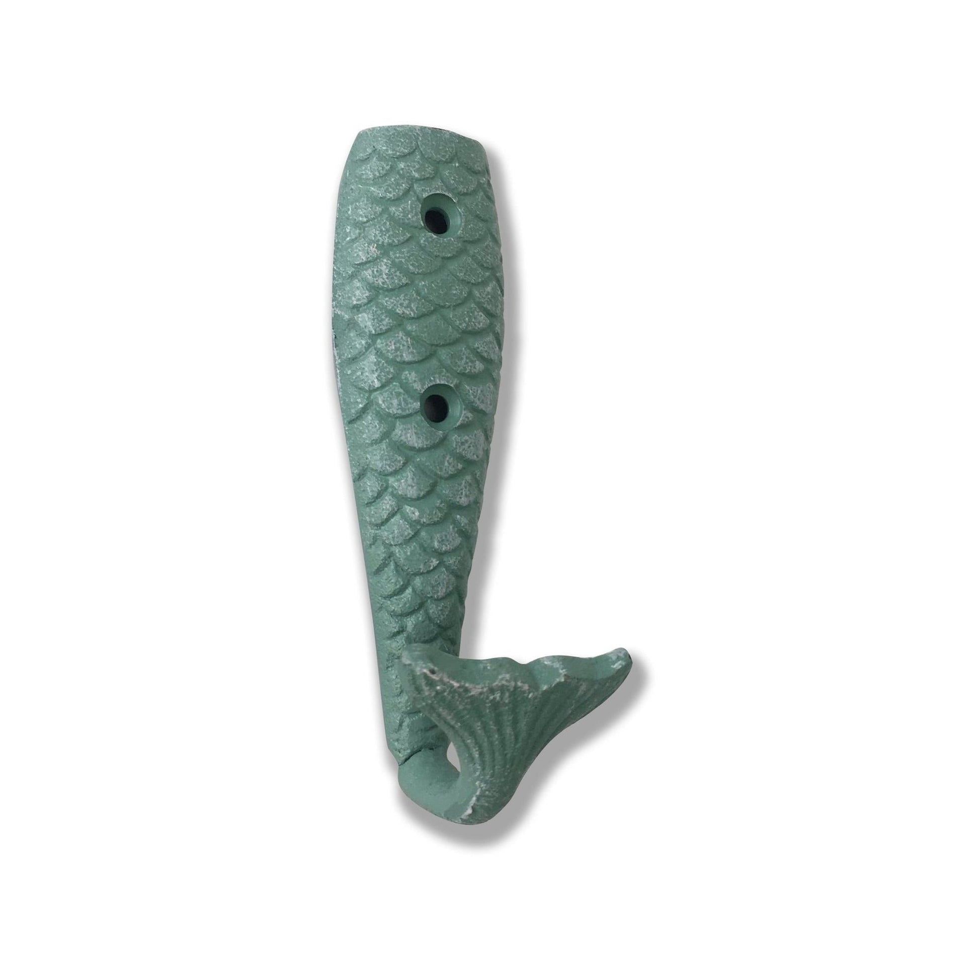 Create a unique and whimsical addition to your home decor with this Cast Iron Mermaid Tail Hook. With its green hue and 1.6x1.7x5 inch dimensions, this nautical wall hook is perfect for hanging items indoors and outdoors. Showcase your love for mermaids with this eye-catching and practical Cast Iron Mermaid Tail Hook.