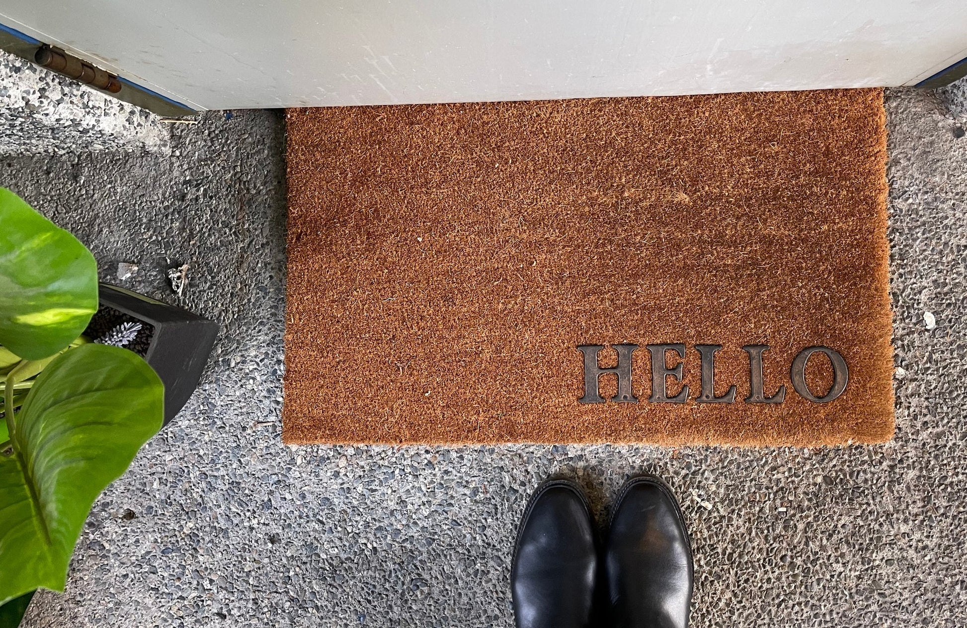 HELLO Doormat, Natural,1.5 cm thick, Rubber Flocked Copper Finish, On Sale 20% Off