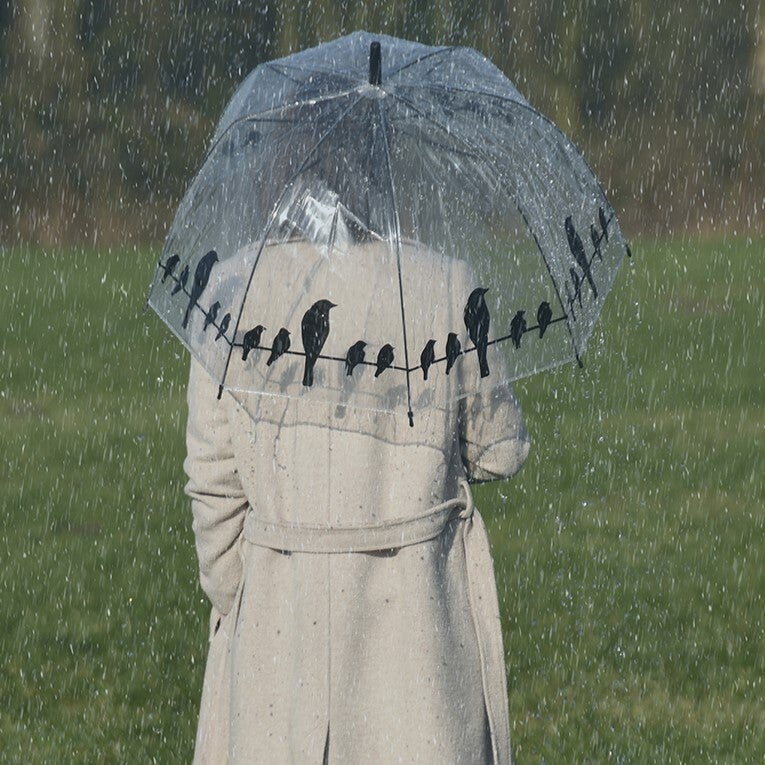 This transparent printed umbrella makes going out for a walk in the rain a joy. The print depicts the silhouettes of birds on a wire. The transparent material mean you can still be aware of your surroundings while walking.Umbrella transparent birds on wire, POE, metal, PP, UV protection