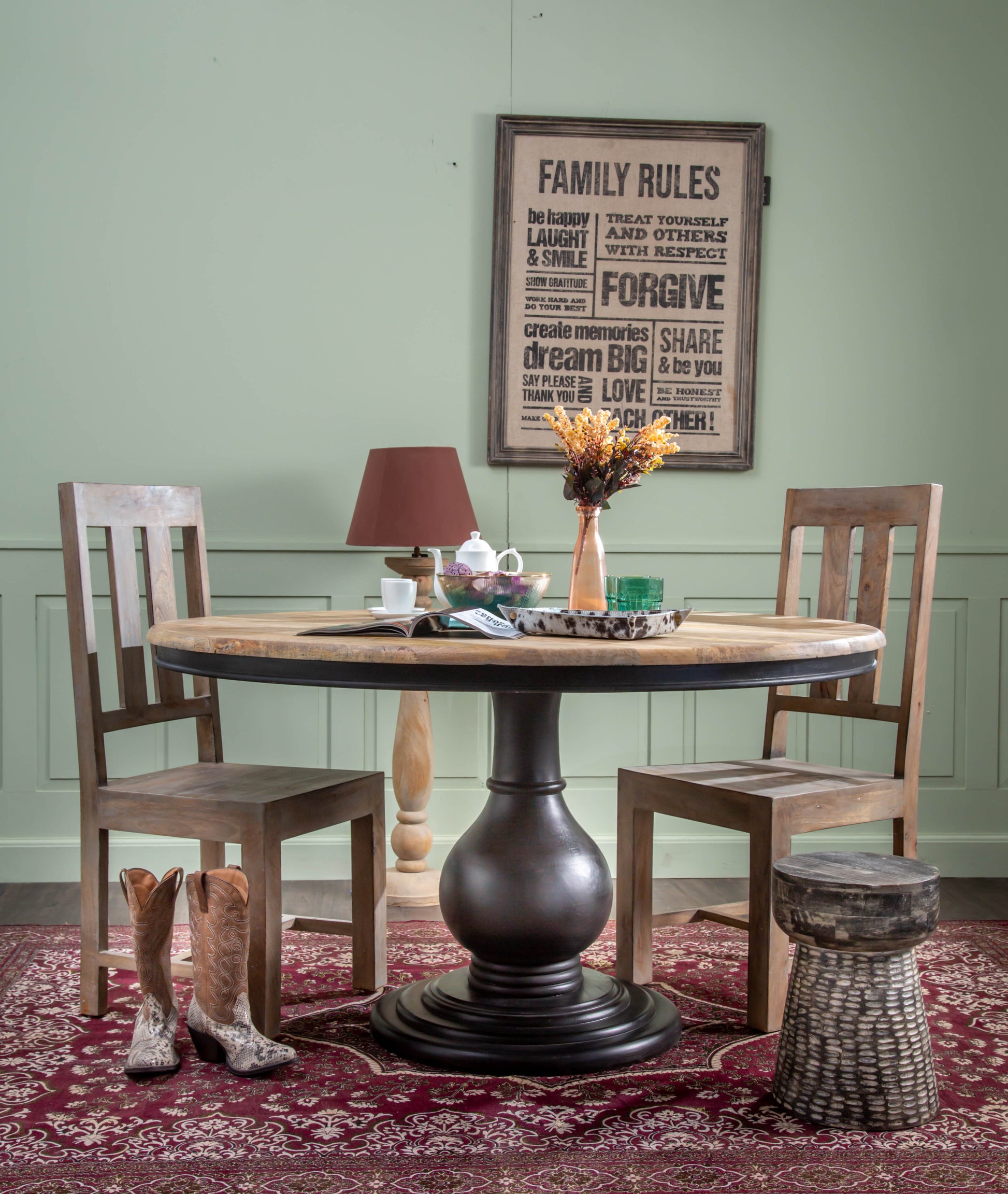 Wooden Pedestal Dining Table, Dia 48", Antique Black, India